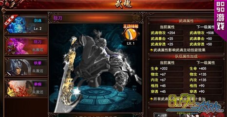 现在游戏共有四种武魂,分别是剑魂、狂刀、铁掌、拳痴。玩家通过主线任务与特殊活动会获得武魂,武魂的属性可以叠加,玩家不需要担心武魂间的强弱对比,只需选择最适合队伍的武神即可。武魂拥有队伍属性,队伍属性会加成到角色与豪侠身上,并且还用有天赋技能,武魂的天赋技能大多为辅助技能,通过主动技能触发效果加成到伙伴身上,增强团队实力。