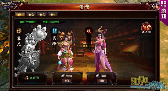 酒馆系统在玩家等级达到15级时开启,且声望达到需求等级后可使用银两或者特殊道具招募豪侠,豪侠有星级差别,星级越高就会越强,并且豪侠分为攻、防、辅三个职业,每个职业有不同的属性成长和豪侠技能,玩家可通过布阵界面携带三个豪侠与其主角进行战斗,也可将豪侠进行助阵,增加战斗属性。
