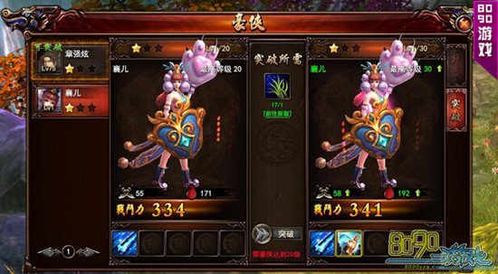 同时豪侠的等级也可以升级,需要消耗一定的经验书、历练书、经验秘籍等道具。当玩家或豪侠达到突破等级后,可使用突破道具将其进行突破。玩家突破后可改变外形、获得技能点和增加主角大量属性,豪侠突破后可获得新技能。