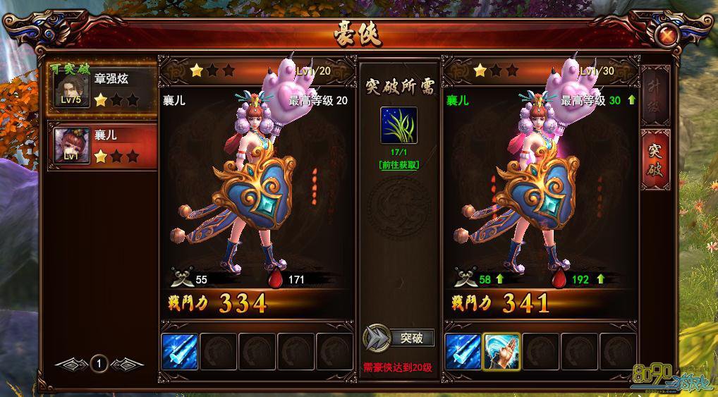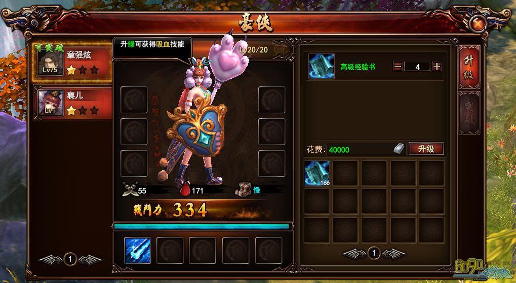 豪侠系统在15级开启,玩家可在此系统中消耗经验书、历练书、经验秘籍等道具提升豪侠等级,当主角或豪侠达到突破等级后,可使用突破道具将其进行突破。主角突破后可改变外形、获得技能点和增加主角大量属性,豪侠突破后可获得新技能。