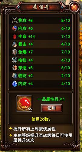 属性丹系统30级开启,玩家可通过击杀怪物来获得属性丹进行系统的升级,打开豪侠界面选择主角,点击属性丹便可进入此系统,布阵系统中也有属性丹系统按钮,点击后也可以进行属性丹培养,属性丹培养会随机增加上阵主角和所有豪侠的战斗属性,此系统的可培养属性的类型和培养次数会根据主角等级开启和增加,每日次数达到上限后,第二天便可清零重新培养。