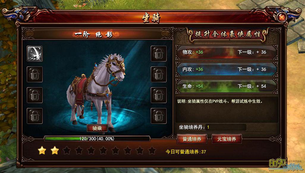 坐骑系统在9级开启,此系统开启后玩家会获得一阶坐骑,可以培养坐骑进行升阶,培养方式分为每日限定次数的普通培养,和道具元宝培养,当阶坐骑星级升满后坐骑进阶,进阶可改变坐骑外观,增加PVE技能,PVP技能和属性,在后期还会开启幻化系统,可选择坐骑外观将坐骑进行幻化。