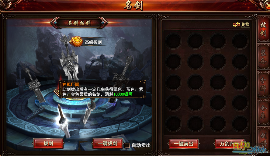 搜索"8090网页游戏"傲剑中名剑拔剑系统可以通过拔剑获得名剑,名剑可以给主角和豪侠增加属性,是战力提升比较重要的一项,拔剑可以通过银两和元宝拔剑,会拔出不同品质的剑,那么拔剑系统怎么玩?金剑如何得到?下面小编就给大家介绍傲剑名剑拔剑的玩法。