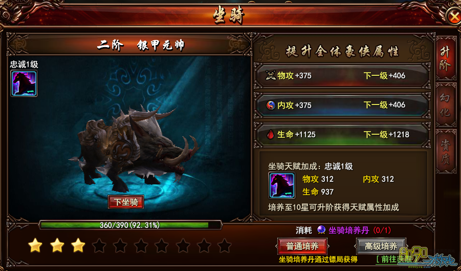 玩家达到等级后就会开启坐骑系统,将获得一阶的战马,坐骑可以骑乘,骑乘后会增加玩家的移动速度,提升跑图效率。玩家可以使用坐骑培养丹升级坐骑,当升级条集满后会增加一个星级,收集十颗星星之后坐骑将会进阶。