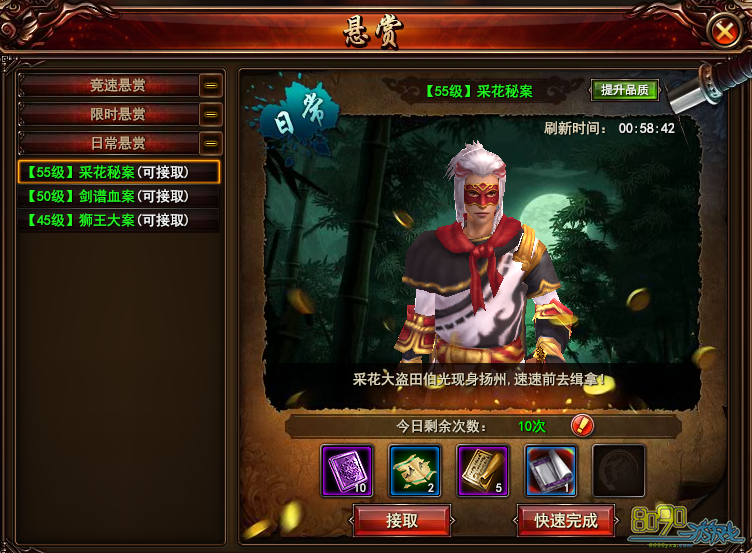 日常悬赏没一小时刷新一次,使用绑定元宝可以刷新任务品质,建议大家在绑定够用的情况下,接取品质高的任务,这样奖励也会提高。