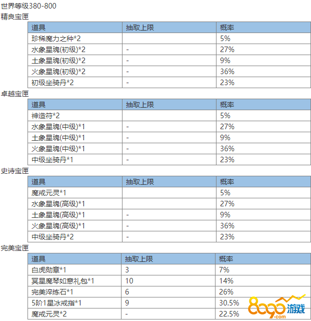 (2)宝匣需要点亮后才能抽取,初始默认点亮精良宝匣,每次抽取可获得宝匣内的一个随机奖励,并有概率点亮下一品质的宝匣。抽取的宝匣品质越高,奖励越好;