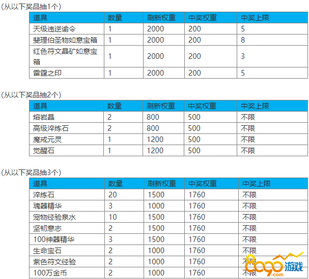 (2) 幸运转盘共有8个奖品,从奖池库中分别抽取1个至尊大奖,2个稀有奖品,5个普通奖品组成。每轮至尊大奖限抽1次,每个稀有奖品限抽2次。当抽到至尊大奖时,可免费刷新转盘奖励