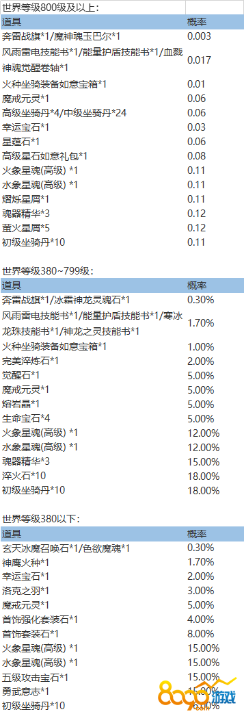世界等级380-799的服燃放耀世爆竹概率开出:耀世大奖如意宝箱(可选:奔雷战旗*1/冰霜神龙灵魂石*1),耀世如意宝箱(可选:风雨雷电技能书*1/能量护盾技能书*1/寒冰龙珠技能书*1/神龙之灵技能书*1),火种坐骑装备如意宝箱、完美淬炼石,觉醒石,魔戒元灵,熔岩晶等珍稀道具;