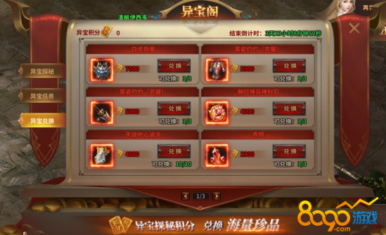 玩家在异宝探秘中可以获得异宝积分,异宝积分可以在异宝兑换中兑换商品,部分异宝限量出售,走过路过前往不要错过哦!