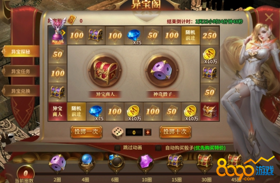 除了使用异宝骰子,玩家还可以使用神奇骰子来选择移动指定点数,想去哪就去哪!当棋子在棋盘上移动达到指定圈数时,还可以领取圈数奖励,珍贵奖励唾手可得!!