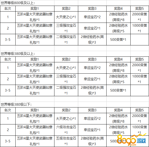 世界等级380~800级嗨点奖励: