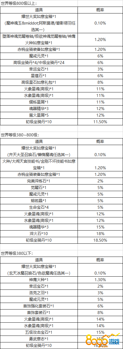 世界等级380以下的服燃放耀世爆竹概率开出:耀世大奖如意宝箱*1(玄天冰魔召唤石/色欲魔魂任选其一),神鹰火种,魔戒元灵,洛克之羽,魔戒元灵等珍稀道具;