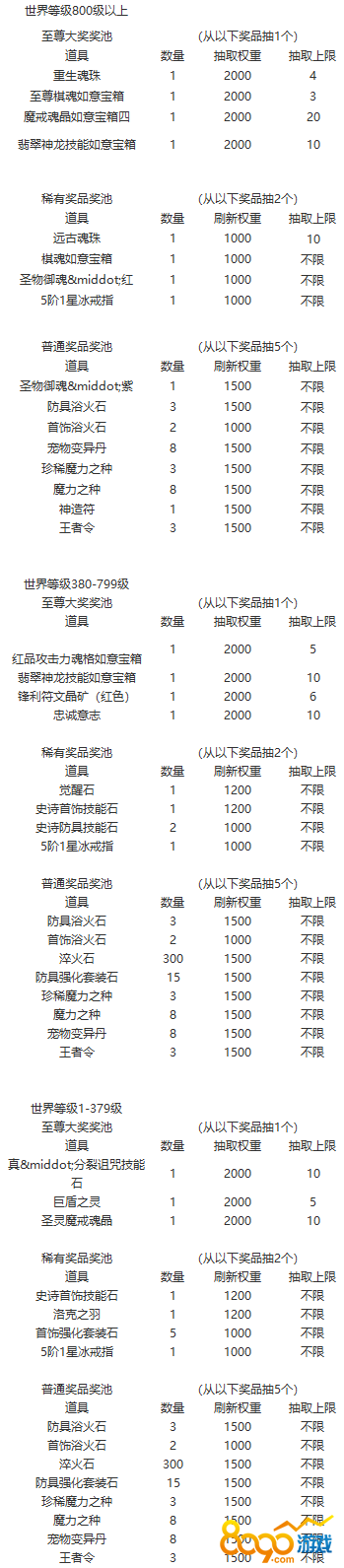 幸运转盘共有8个奖品,从奖池库中分别抽取1个至尊大奖,2个稀有奖品,5个普通奖品组成。每轮至尊大奖限抽1次,每个稀有奖品限抽2次。当抽到至尊大奖时,可免费刷新转盘奖励