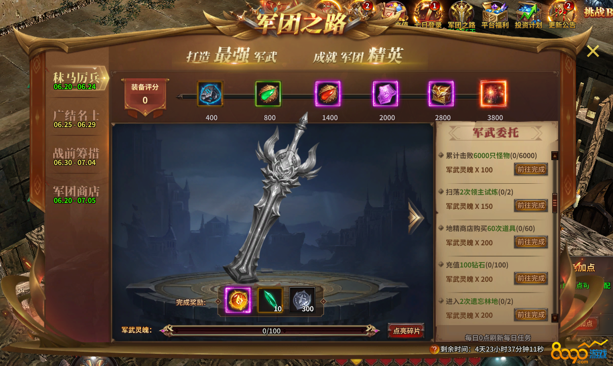 (2)秣马厉兵可通过完成军武委托任务获得军武灵魄,每达指定灵魄数量即可点亮一个碎片。每件军武集齐全部碎片后可领取丰厚奖励。同时在限定时间内,收集的军武碎片越多,装备评分越高,可获得进度奖励越丰厚