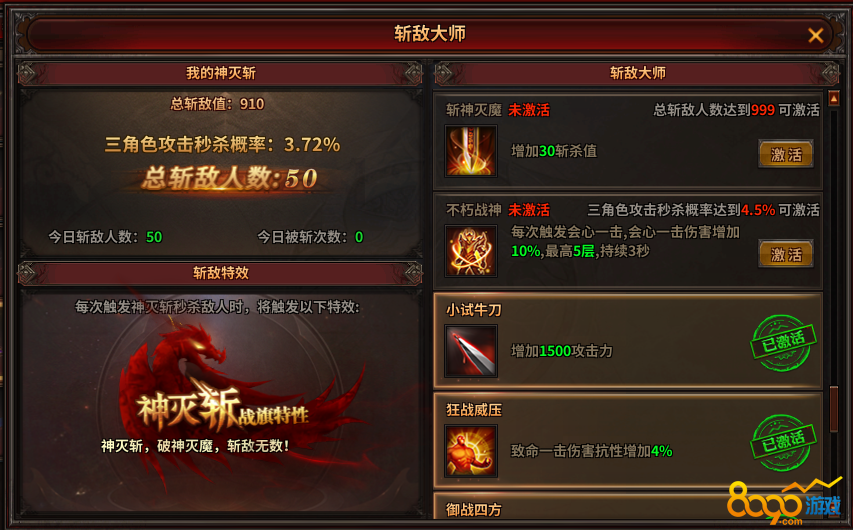 (2)神灭斩成就:统计今日斩敌人数和被斩次数,以及总斩敌人数