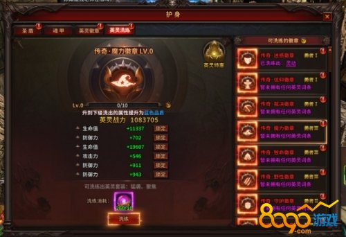 通过分解多余英灵徽章可获得洗练丹,洗练可重置英灵徽章的英灵属性。洗练次数越多,可获得的属性稀有度越高