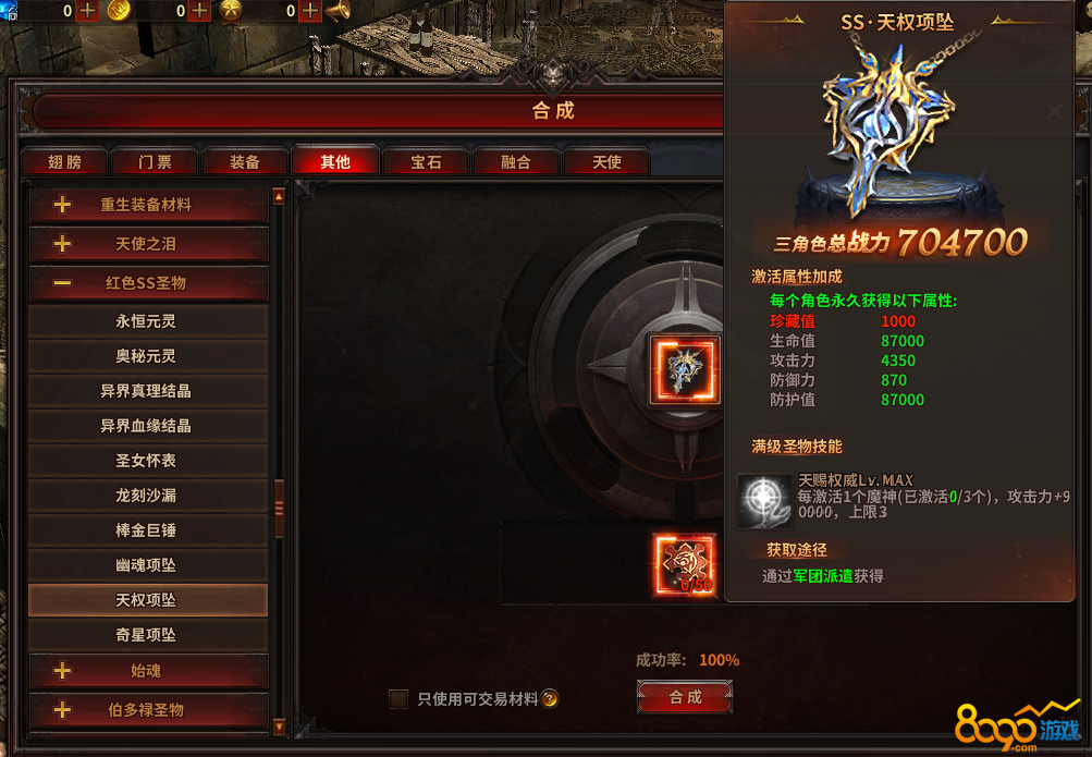 (1) 新增SS级圣物天权项坠、奇星项链,可用传奇圣物合成碎片进行合成