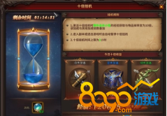 在十倍挂机中,玩家可以使用十倍挂机圣水,增加十倍挂机时间。激活十倍挂机时,在野外击杀小怪的经验获取与物品掉率变为十倍。进入副本或者退出游戏时,十倍挂机时间将会自动暂停。玩家可以随时冻结/激活已有的十倍挂机时间,真正的随心所欲高效挂机!十倍挂机的时间上限是2小时。