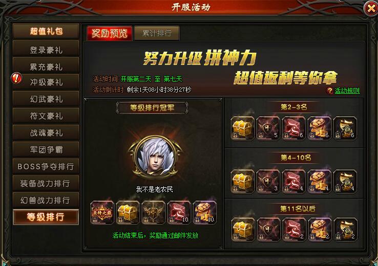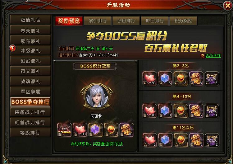 (3)每日达到一定名次可领取每日排行奖励,次日领取;活动结束,根据boss总积分,通过邮件发放累计排行奖励;
