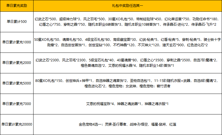 单日礼包按实际充值订单金额计算,每档奖励选1个道具,礼包可组合申请(组合金额不大于当天充值金额),