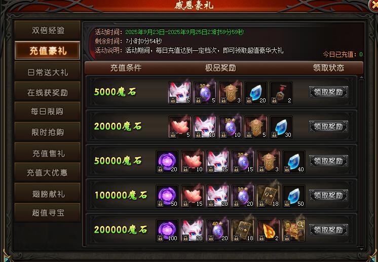 活动内容:活动期间,每天充值达到指定数额魔石可领取活动奖励