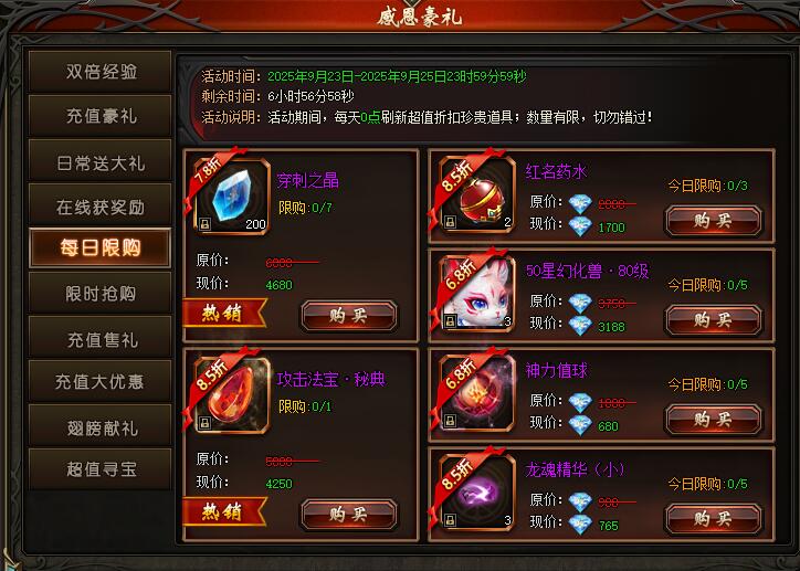 活动内容:活动期间,每天0点刷新超值折扣珍贵道具! 数量优先,切勿错过!!