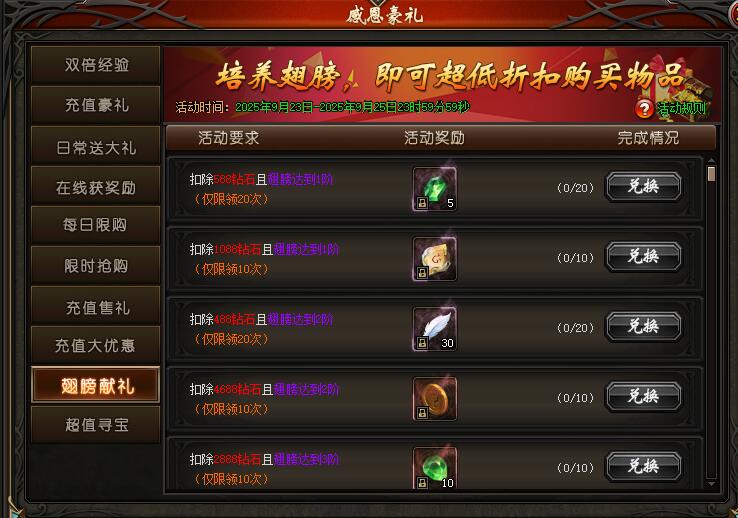 活动内容:活动期间,翅膀到指定阶数且消耗少量钻石可领取活动奖励,阶数越高,奖励越丰厚!