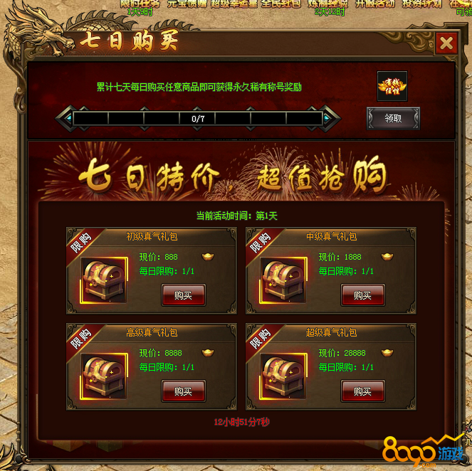 开服前七天,每天根据开服竞技的资源需求刷新对应的资源礼包,各种礼包限购一个,每天都买,累计七天还可领取限定称号“有钱任性”