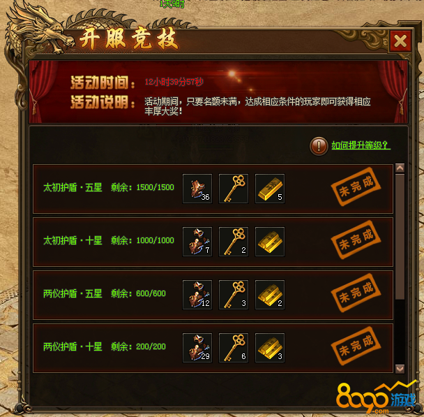 玩家在开服第七天升级护盾达到一定阶数可领取护盾碎片、寻宝钥匙和金砖等奖励,名额有限先到先得。