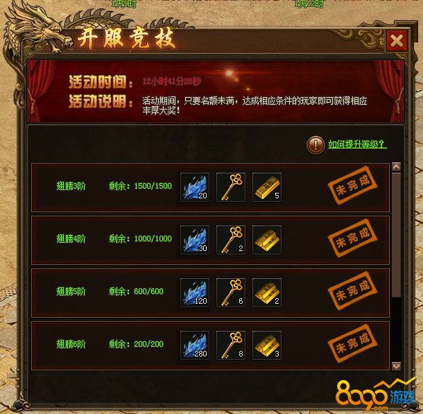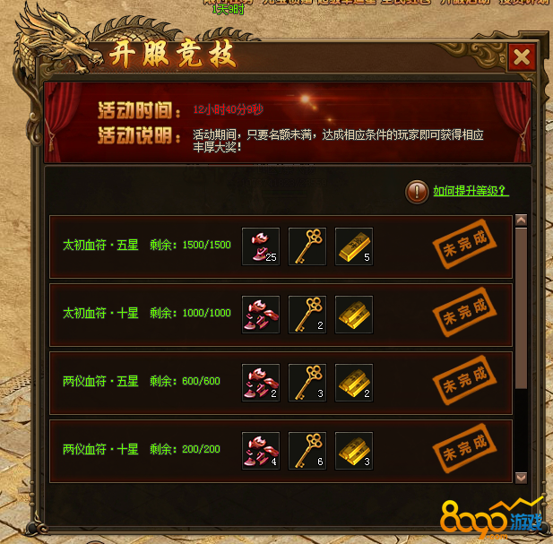玩家在开服第六天升级血符达到一定阶数可领取血符碎片、寻宝钥匙和金砖等奖励,名额有限先到先得。