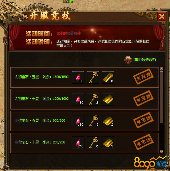 玩家在开服第四天升级宝石达到一定阶数可领取宝石碎片、寻宝钥匙和金砖等奖励,名额有限先到先得。