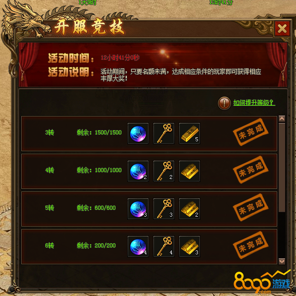 玩家在开服第三天升级转生达到一定阶数可领取高级转生丹、寻宝钥匙和金砖等奖励,名额有限先到先得。