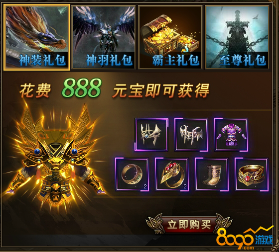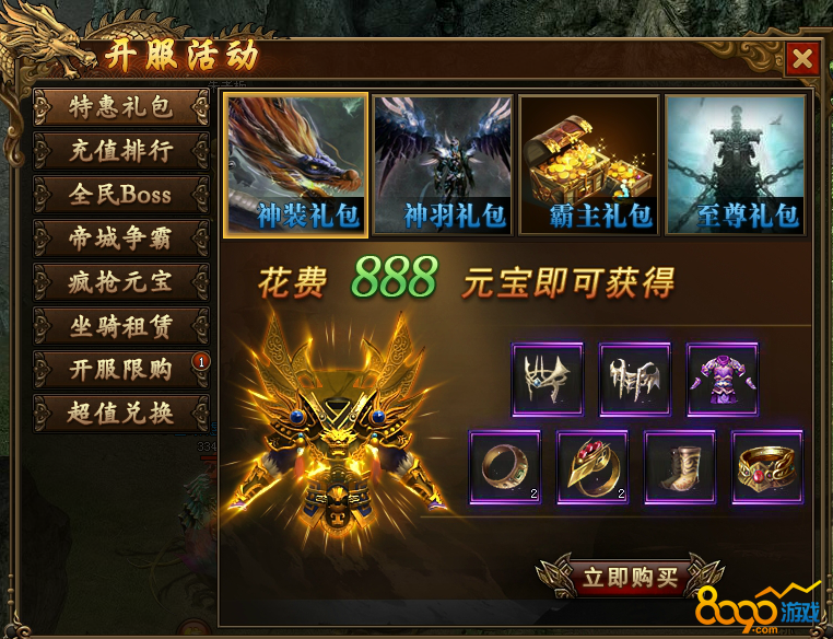 特惠礼包包括神装礼包、神羽礼包、霸主礼包、至尊礼包。