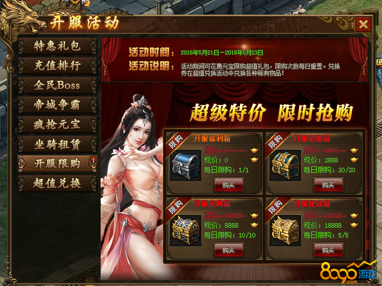 开服前三日,玩家通过开服限购活动获得开服庆典礼券,使用相应数量的开服庆典礼券换取对应道具奖励。