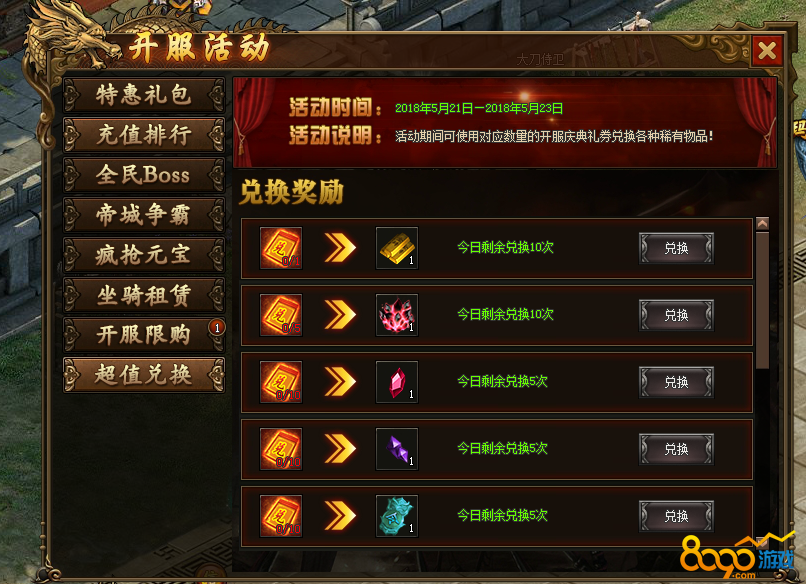 开服庆典礼券*600兑换稀有坐骑(8天)*1,每日可兑换1次;