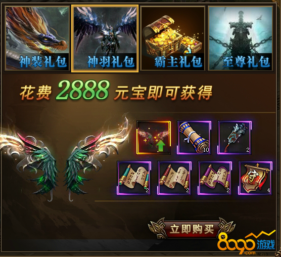 神翼礼包中有包括3级翅膀直升符、功勋卷轴(中)*10、超级BOSS召唤令*2、副本卷轴*2、转生卷轴*2、玛雅卷轴*2、高级守卫令牌*4在内的一系列稀有道具。