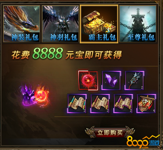 霸主礼包中有包括超级真气丹(元神)、魂珠碎片(大)、超级BOSS召唤令*2、副本卷轴*2、转生卷轴*2、玛雅卷轴*2、高级守卫令牌*4在内的一系列稀有道具。