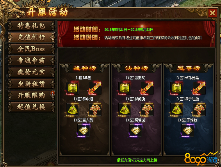 开服前三日各职业充值前三名能够分别获得豪华奖励。