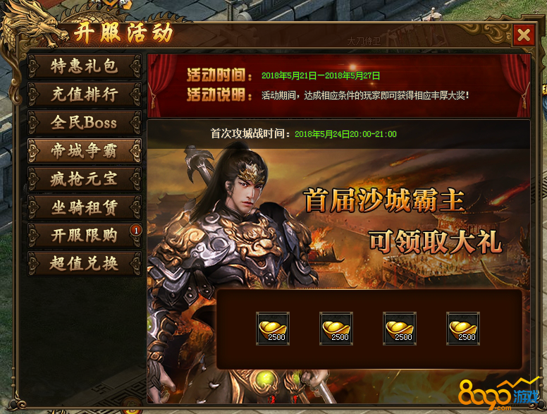开服第四天晚上8-9点开启的首次攻占沙巴克的公会会长可获得大量元宝奖励。