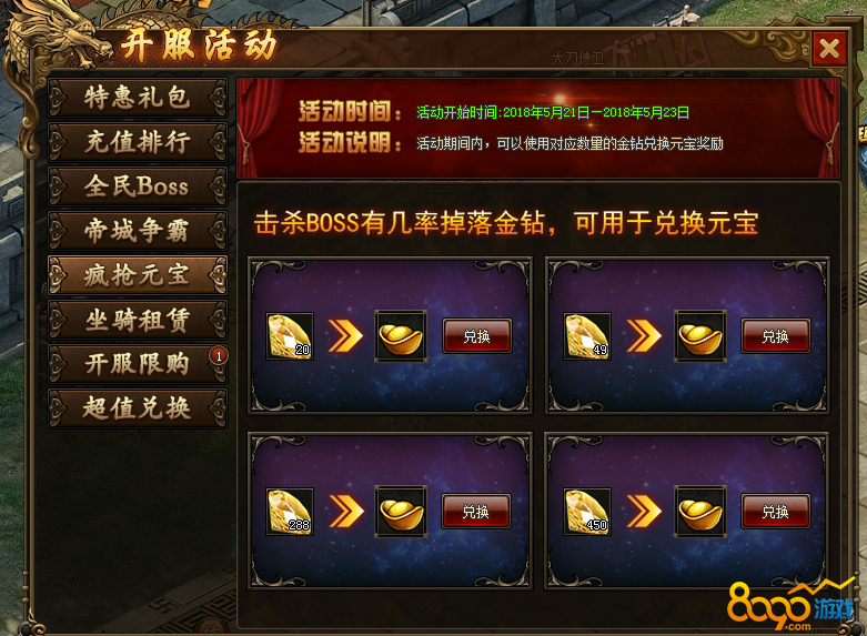 开服前三日,玩家击败100级及以上BOSS会掉落金钻,使用金钻可兑换相应元宝。