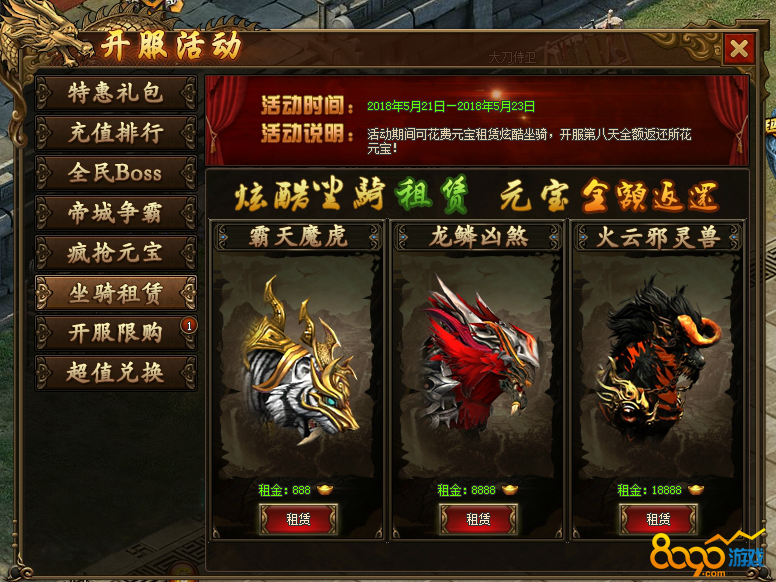 开服前三日,玩家可花费元宝租赁一只或多只带有属性的炫酷坐骑,花费的元宝会在开服第八日通过邮件全额返还。