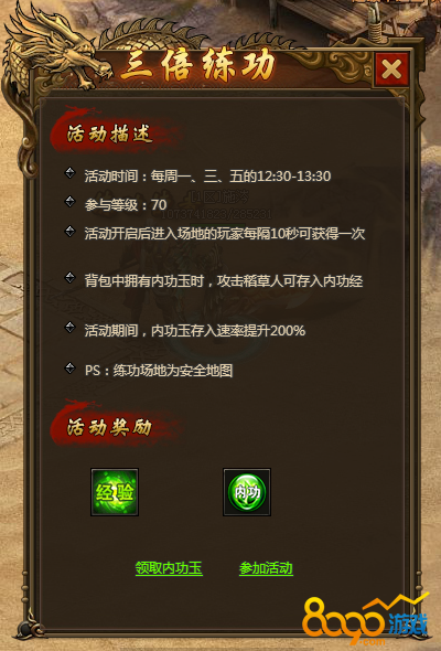 当玩家等级达到70级时可在三倍练功活动时间通过三倍练功NPC进入三倍练功