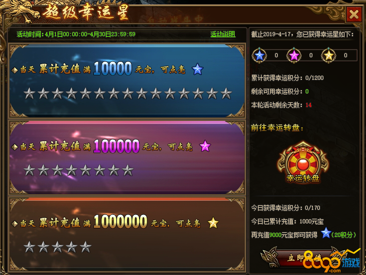 搜索"8090网页游戏"暗黑灵界游戏中超级幸运星是期限一个月的活动每天累计充值达到一定的金额可激活对应的幸运星,每天最多可激活三种幸运星各一颗,激活一颗蓝色幸运星就可以获得20幸运积分,激活一颗紫色幸运星就可以获得50幸运积分,激活一颗金色幸运星就可以获得100幸运积分,消耗幸运积分可在幸运转盘中抽取各种稀有道具,幸运星和幸运积分每月月底会充值,如果没用完就清空的。