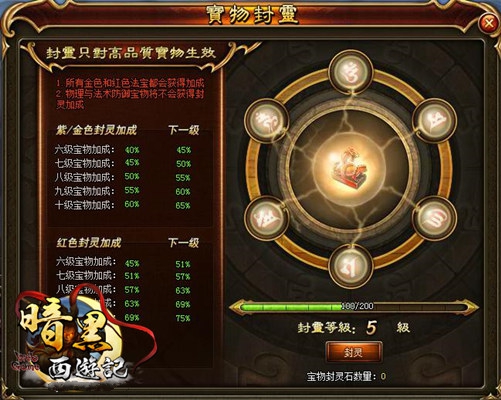 暗黑西游记当中所有紫色、金色和红色品质的宝物,只要等级到达6级之上,均可以用宝物封灵石进行封灵从而获得属性加成。宝物等级越高,宝物品质越高,宝物封灵等级越高,获得的属性加成值就越多!