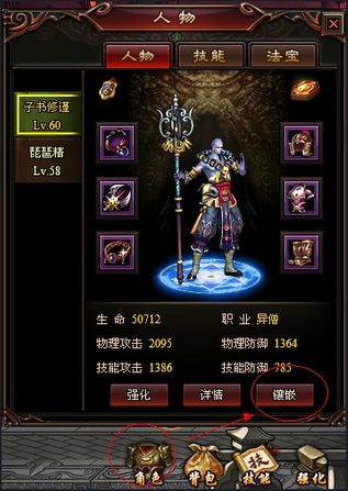 首先,打开强化界面后选择“镶嵌”,镶嵌宝石需要花费一定的金币。