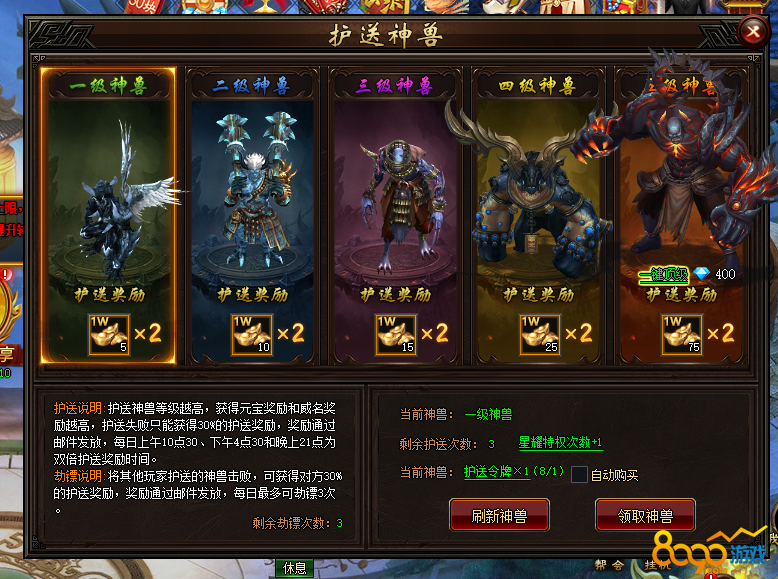 刷新神兽有失败的概率,神兽的等级越高失败的的概率越大,失败有可能会降级,每天有3次免费刷新神兽的机会,用完了可以用护送令牌去刷新也可以用钻石去买护送令牌。花费是20钻石/一个,护送次数是每日3次,星耀特权可以加1次。