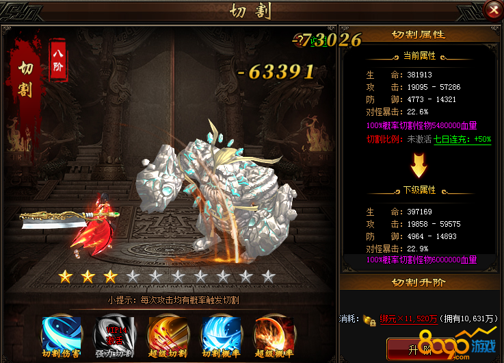 切割是传奇游戏必备的一个功能,因为怪物的血量非常高,提升切割可以更快的增加打boss的速度。不然没有办法去刷boss所以这个是必然要升级的。