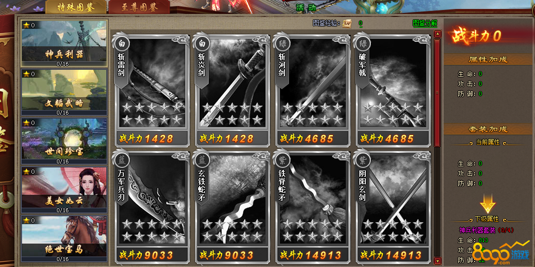 图鉴系统是一个收集类的玩法,这个玩法非常有趣。可以手机各种武器,然后坐骑以及一切能收集的东西,每升一级都可以提升战力和属性。