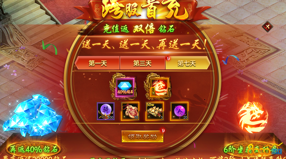需要跨服充值的最后一天活动,充值之后获得这个坐骑直升丹非常的有用。因为会比直接升到六阶少花很多钻石或者道具。