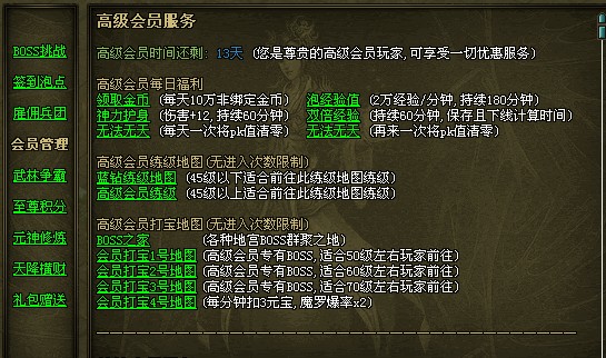 会员当然是要享受些会员特权啦~~在获得会员身份后,每天可以领取各种丰厚的会员服务。其中包括每日均可领取10万金币、1小时的神力、在线泡点、经验暴涨、会员练级和boss之家等。金钱的作用就不用多解释,作为游戏中的硬通货,是平时装备和消耗品的重要保障,而且包括升级雇佣兵荣誉和提升元神等都需要花费相关的金币。其他的下面在给你一一道来,绝对的会员享受。